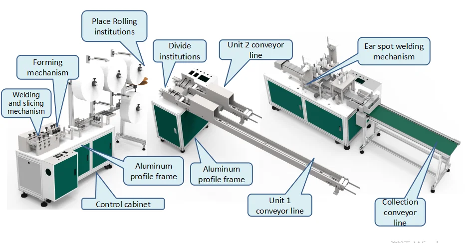 mask machine slicing, mask connecting line and mask outer ear strap machine to form one drag two automatic disposable three-layer mask machine production line. | |||||||