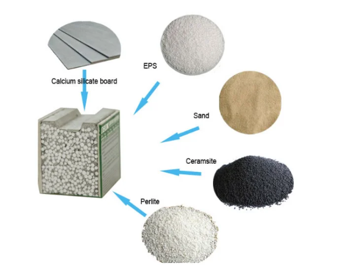 fly ash, eps particle, ceramsite and chemical additives. since there are the calcium silicate board on the surface, so if you need this kind of panel, then you need to make sure if you could easily find the calcium silicate board locally.