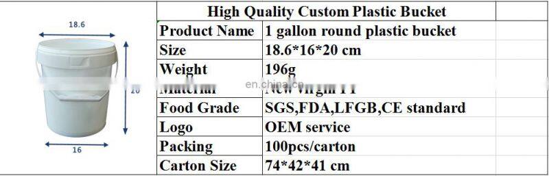 The 1Gallon plastic bucket is Food Grade PP material. It will makea your life more confortable by using it as a FOOD CONTAINER. Moreover our company provides OED service, so you could design your unique belongings !