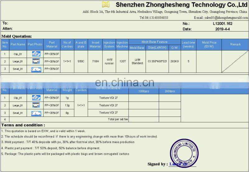 After receiving your RFQ, we will quote price and send you a detailed quotation sheet. We will mention the mold specification and price, also product price inlcuding shipping time. If you are urgent, your quotation will be prioritized and avaialble within 4 hours.