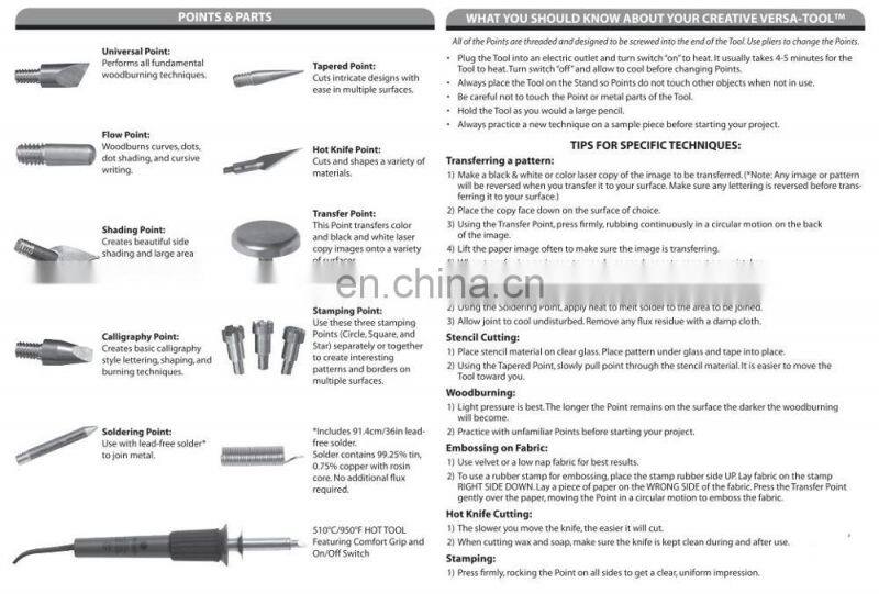 This tool has options and functions for all types of needs for hobbyists, crafters, and artists; Wood burning, Leather Crafting, Soldering, Stamping, Paper Crafting, Hot Knife Cutting, Pattern Transferring, Embossing, Stencil Cutting, Personalizing, and so much more.