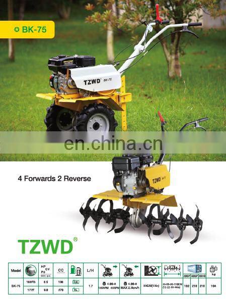 Mini tiller is a kind of practical tool which specially designed for mountainous areas and small piece of land, it introduced advanced technology of manufacturing tillage machine at home and abroad, with the characteristics of high efficiency, compact appearance, easy to operate and maintenance. With 4 forwards and 2 reverse , the tiller BK-75 can be flexibly adjusted the speed by owner. 6.5HP with 196CC can work in the big farmland area. Good parts assembled, strictly quality control system, compact structure, beautiful appearance. BK-75 also can work in the paddy field neatly.