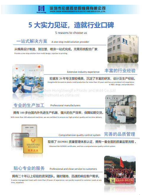 Established in 1997, Hongshengfa Mold & Plastic Part Co., Ltd. is a private-owned high-tech corporation, specialized in injection molds designing and manufacturing, plastic parts molding, and painting. We focused on the development, manufacturing, and production of plastic parts in the industries of household appliances, industrial controllers, daily necessities, auto parts, beauty equipment, and medical equipment. HongShengFa has more than 20 years of plastic production experience and provides mold development and manufacturing solutions to nearly 100 different companies in China and abroad.