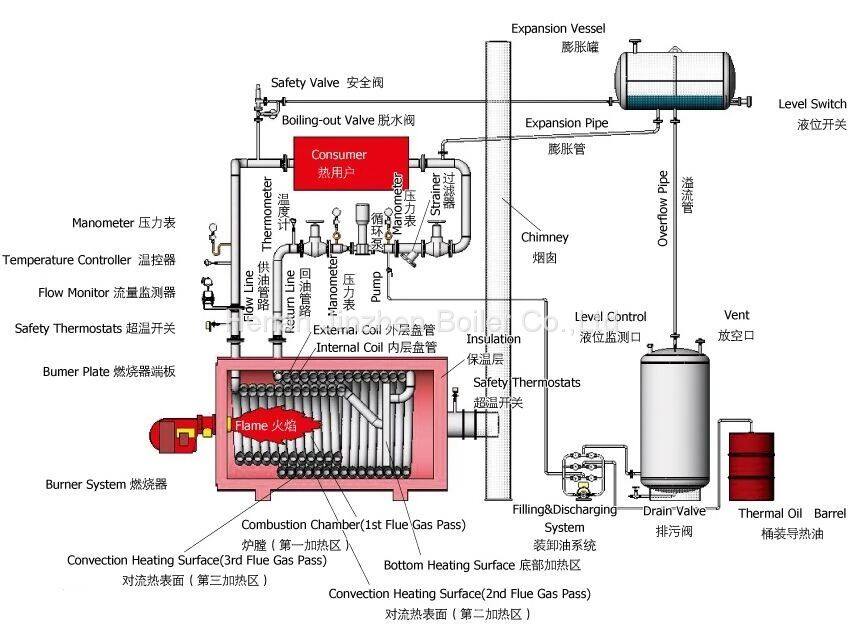 The thermal oil heater is a kind of special industrial furnace which uses diesel oil as the fuel, the furnace takes heat carrier oil as medium and uses the hot oil circulating pump force the medium to make liquid circulation; then the thermal energy will be transmitted to the devices and back to the furnace to be reheated.