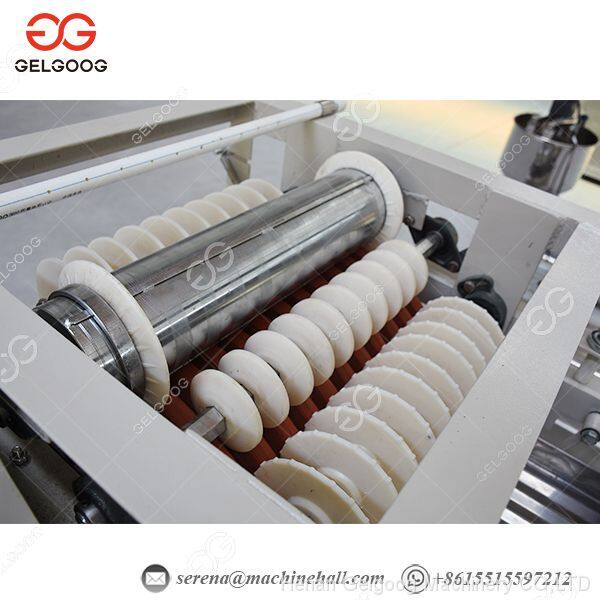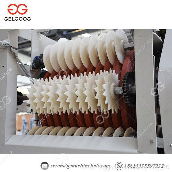 When the skin of original material is soft enough, the machine boasts a better effect of peeling. When original materials are put in the feed hopper and move into peeling rubber wheel, the skin and kernel are separated by the wheel in the process of rotation.