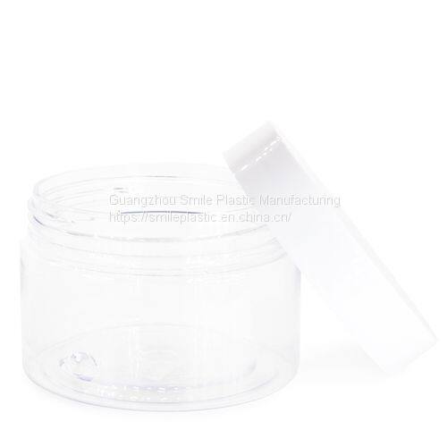Bottle No. SM0723-200 Necksize 89mm Capacity 200g / 7.05oz(available 200g 250g 300g350g) Diameter 92mm Height 49mm Color clear, white, customized Material cream jar: PET; lid: PP MOQ 5000 pcs