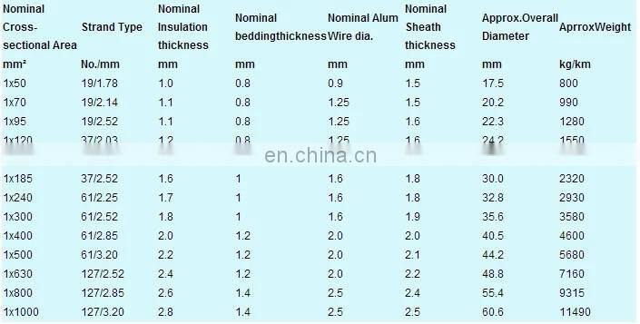 Nominal cross-sectional areas:1.5 mm2 , 2.5 mm2 ,4 mm2 , 6 mm2 , 10 mm2 , 16 mm2 ,25 mm2 , 35 mm2 , 50 mm2 ,70 mm2 , 95 mm2 ,120 mm2 ,150 mm2 ,185 mm2 ,240 mm2 ,300 mm2 400 mm2 500 mm2 630 mm2 800 mm2