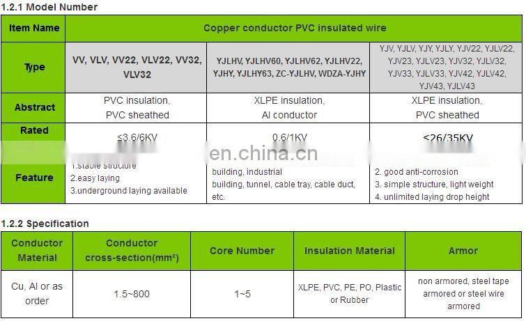 Construction: Cu/Al conductor, XLPE insulation, PVC sheathed electric cable
