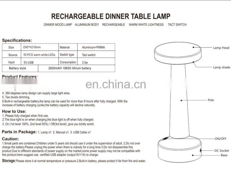 Battery Operated Reading Work Table Lamp LED Rechargeable Restaurant Cordless Lamp