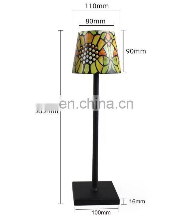 Feature | Black+ White(Customized Colors Acceptable) and 48pcs Warm white LEDS Application in Home+Hotel+Restaurant+BAR+CAFE Function: Lighting Function usb hotel table lamp/Feature: American Best Selling Modern Style Table Lamps/Logo And Pattern: Customized Logo And Pattern Acceptable Tiffany Table Lamp with shade ,base,USB interface,rechargeable battery and pole. Input 5V USB /Touch switch dimmable | ||||||