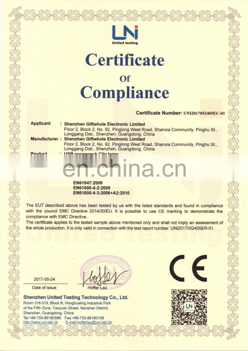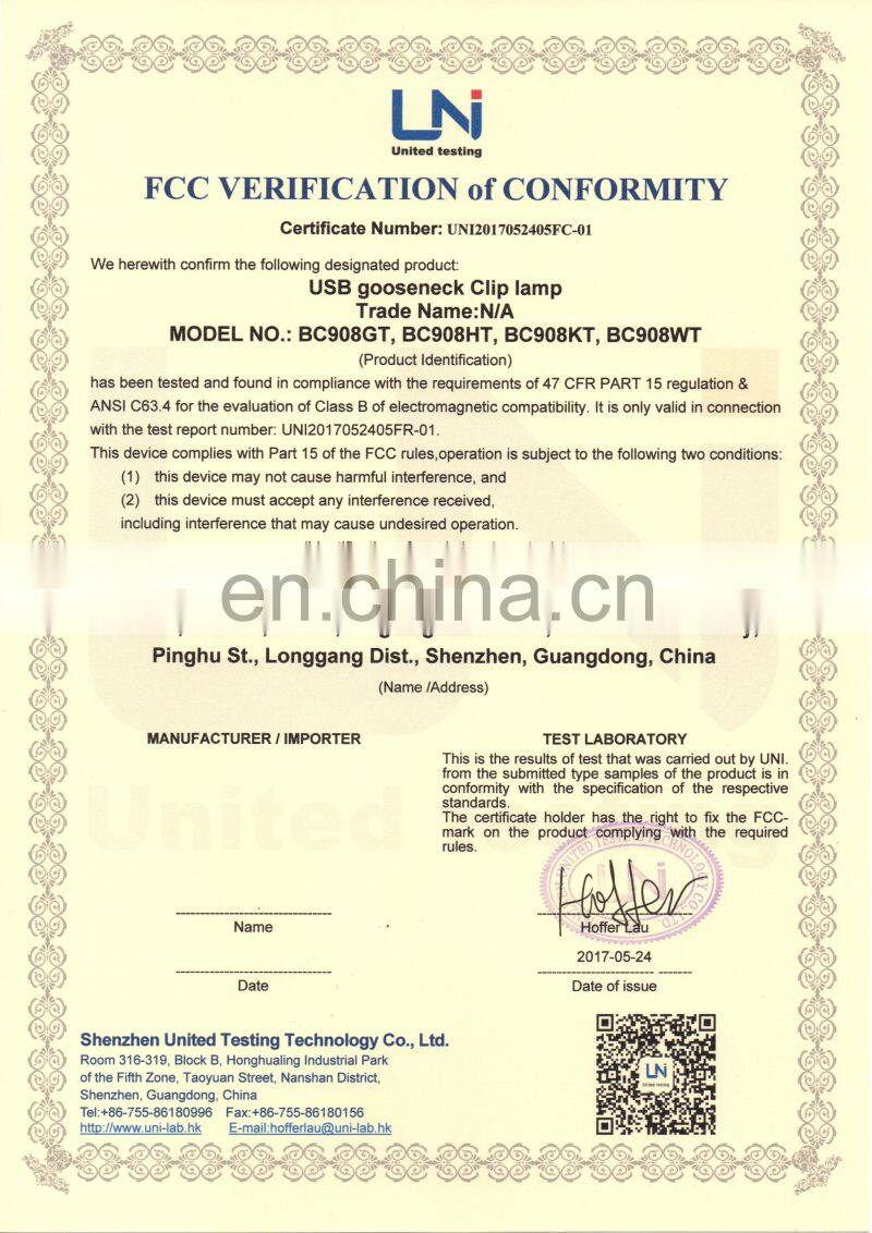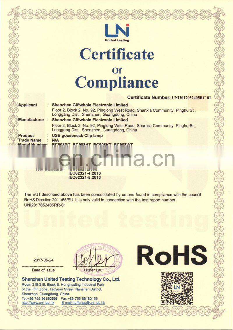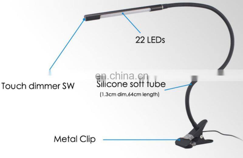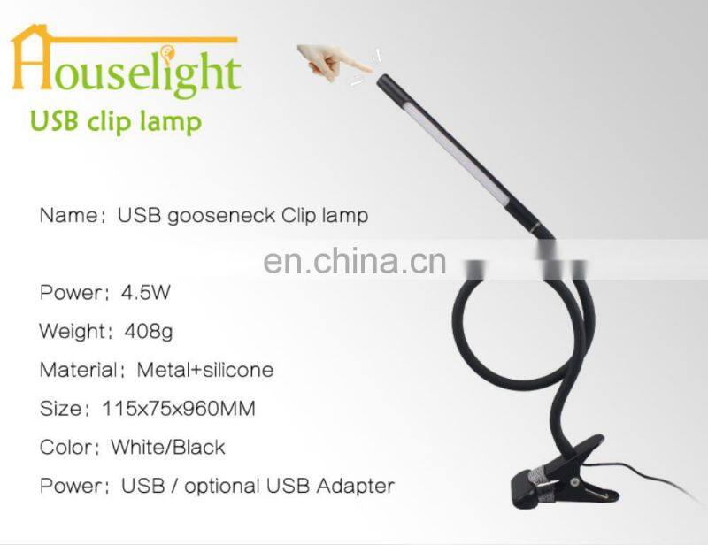 Feature | White+Black color Application in Residential+Office Flexible Arm, Gooseneck clip light,22pcs SMT leds,metal clip,Sillicon soft tube LED Light Source:4.5W,3000K,250LM Function: Lighting Function(Clip light) Power:USB/optional USB Adapter ,USB interface Logo: Accept Logo Customized Switch type:Touch Switch on/off with dimmer function | ||||||