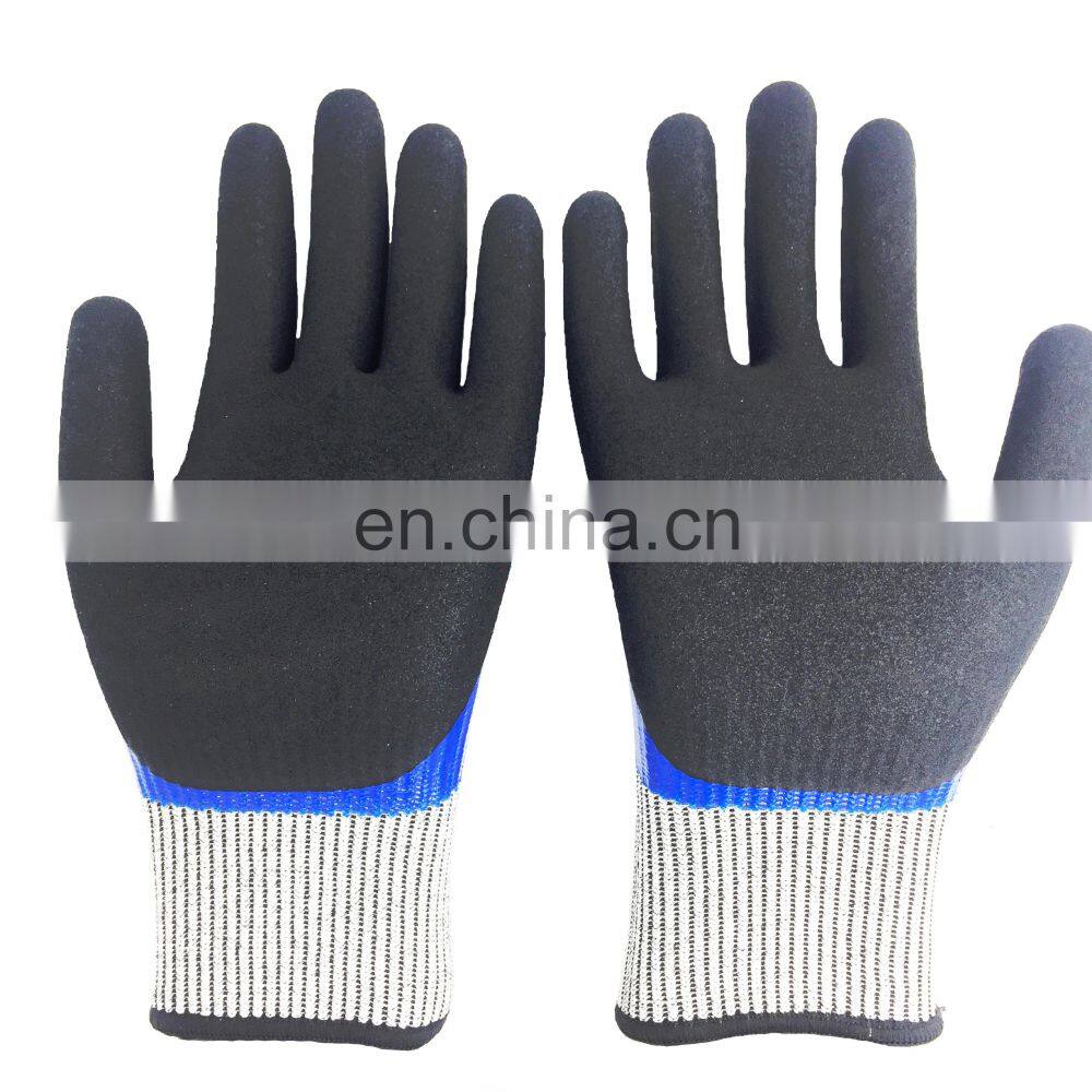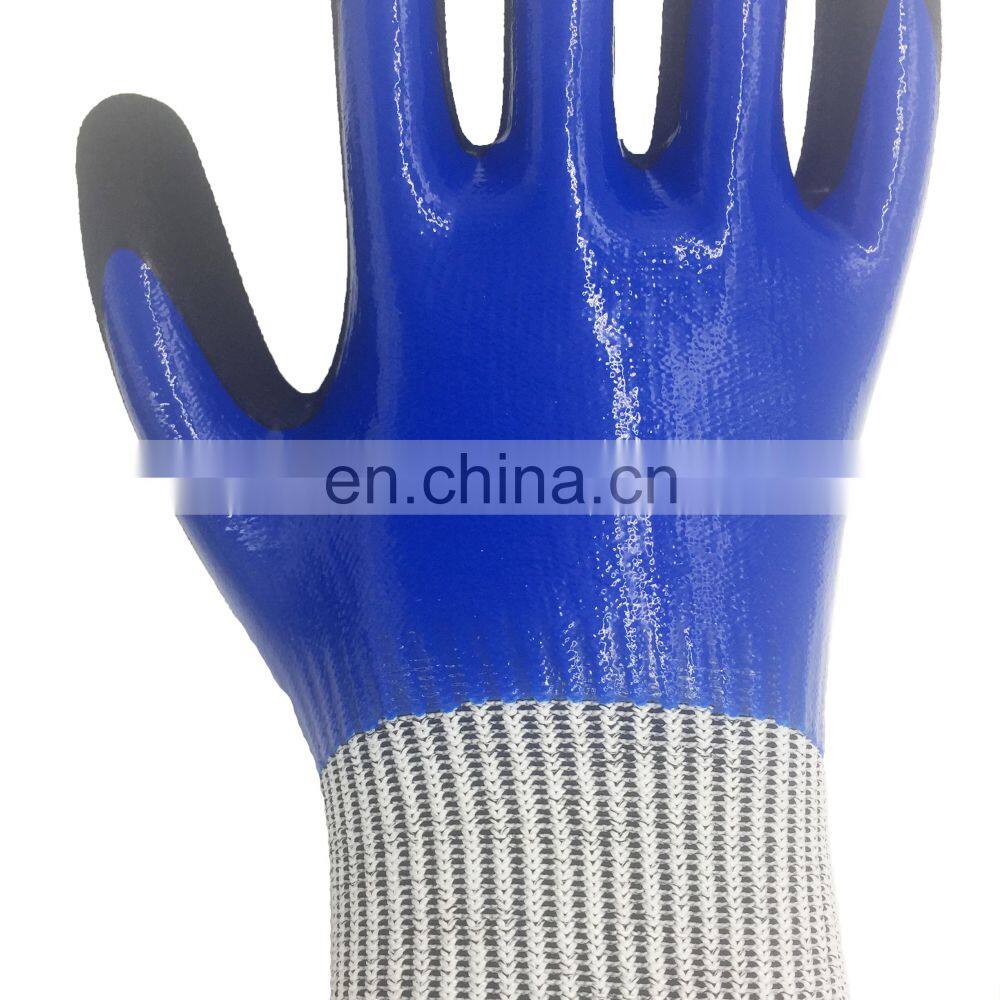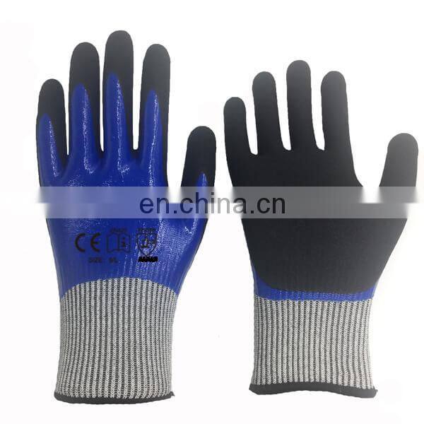 Anti Cut Level 5 HPPE Liner Nitrile Full Coated + Sandy Palm Coated Cut Resistant Gloves