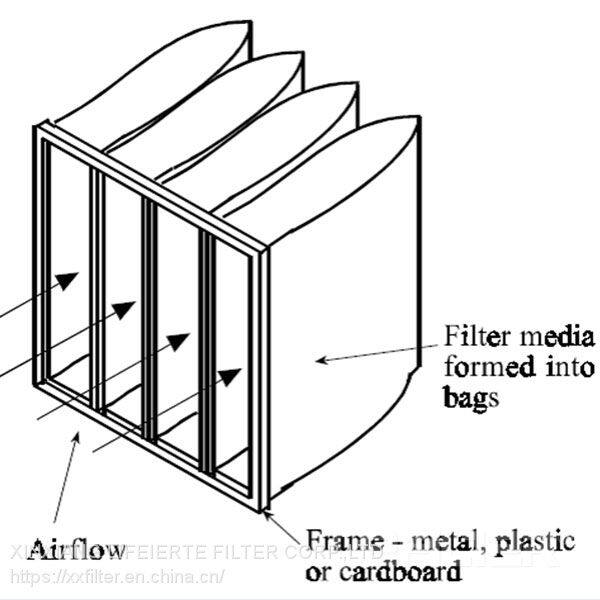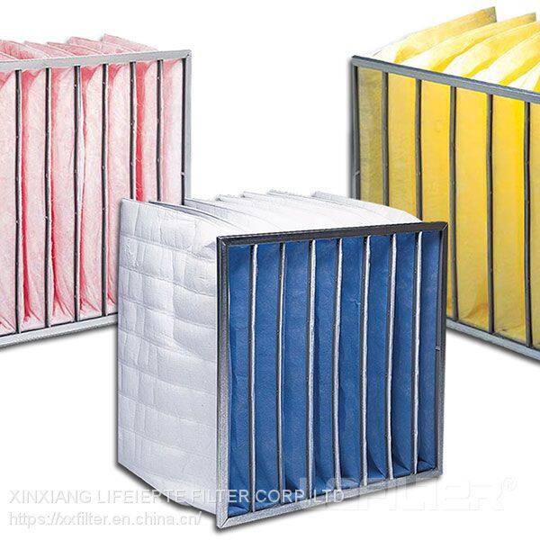 1.Synthetic fiber pocket air filter, it is processed by high-powered thermal-melt nonwovens of the anti-fractured synthetic fiber, the increasing structure, high filter efficiency, large dust holding capacity;