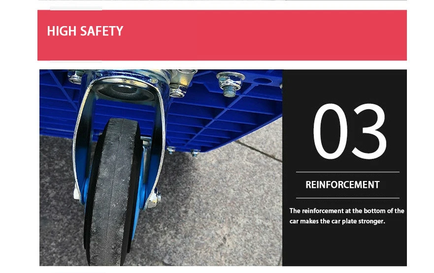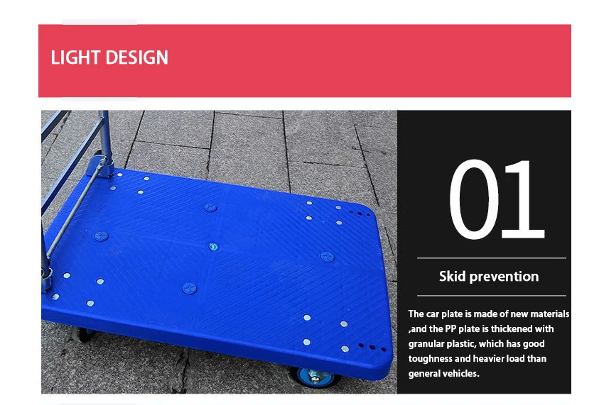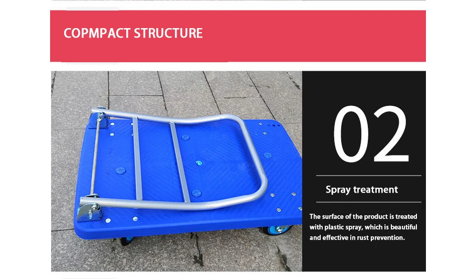 platform trolley advantages:1. Blue plastic body, neat appearance 2. High-strength design 3. Metal and folding handle 4. Easy to clean surface 5. Quiet casters and plastic body help eliminate noise 6. Easy to grip handles and control 7. Pushing forward placidly and smoothly 8. Impact resistance 9. Long-span life