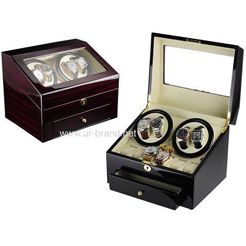 Material: Wooden box paint in high glossy; Japan MABUCHI motor; Silver metal hinges for connecting the cover and box; One watch holder; A lid with transparent acrylic window, 4 programs fixed; AC/DC operated.