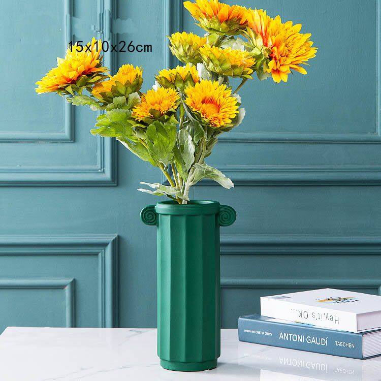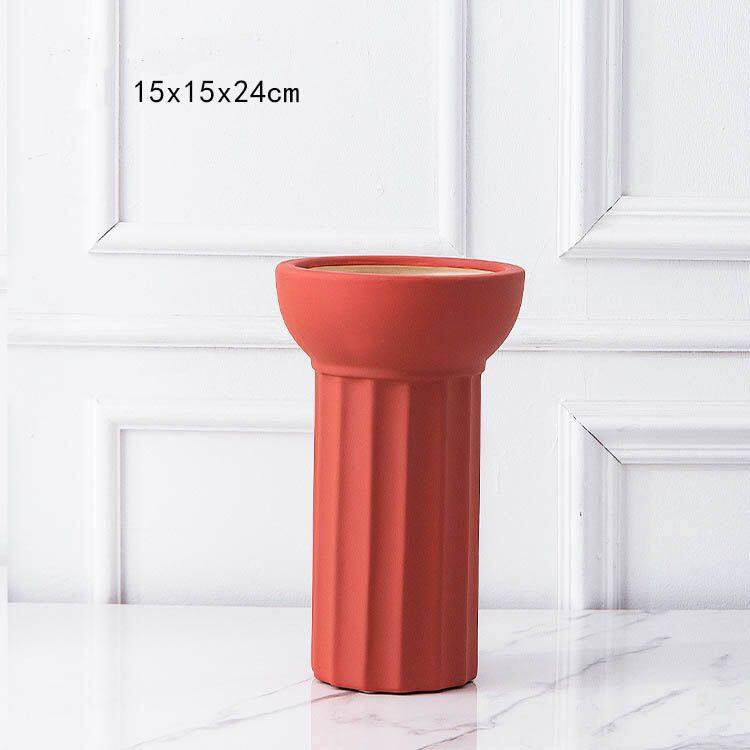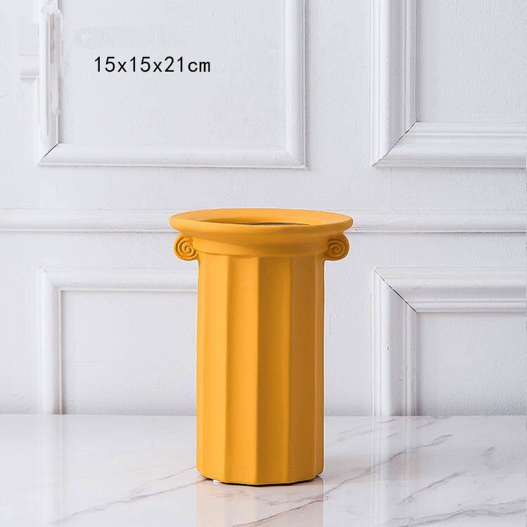 This ceramic vase is in the shape of a Roman pillar, using the technique of colored painting.It comes in six colors and five shapes: green, white, orange, dark green, rose and dark red.