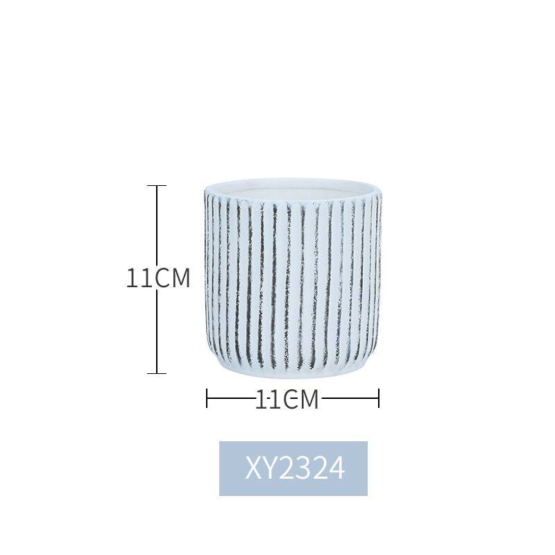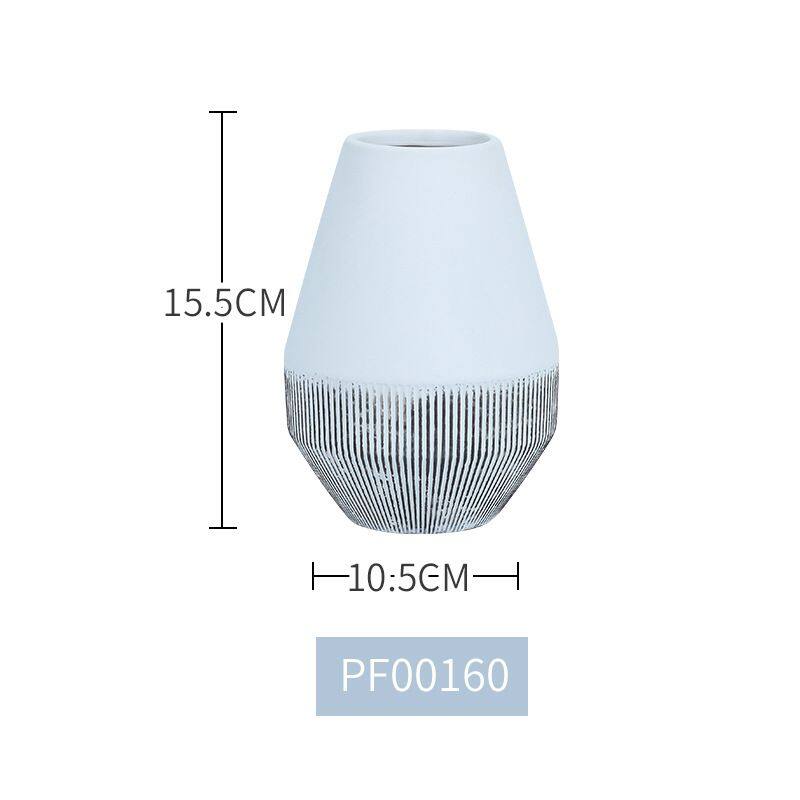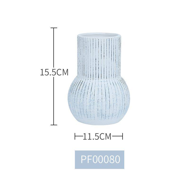 This ceramic vase has a white striped body. The glaze process is used. The surface process is painted and glazed.This vase comes in five styles.