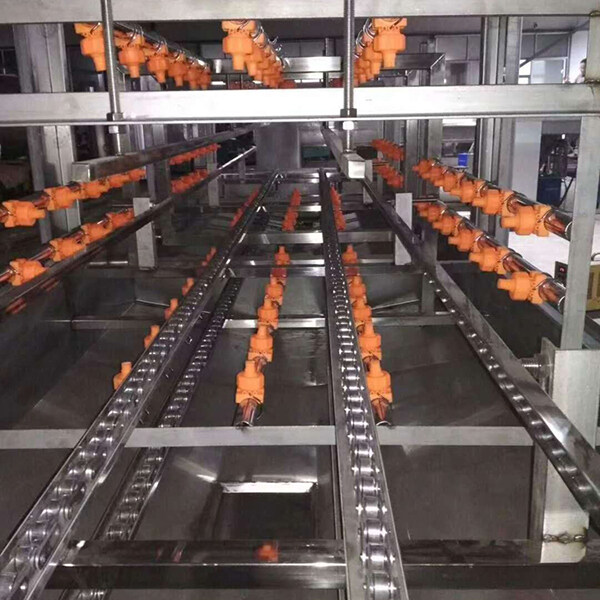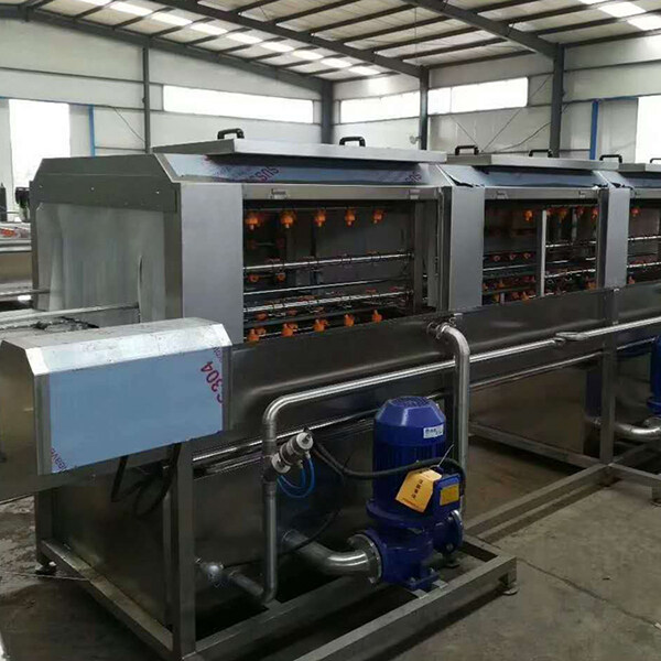 steam is injected to water directly for heating; the spraying nozzles are used in all directions, so crates can be cleaned from different directions; there are three washing sections, 1st section by spraying alkali solution, cleaning temperature 80 degrees; 2nd section by spraying hot water, temperature 80 degrees; 3rd by normal water cleaning and meanwhile cool the crates before output; This machine is driven by chain so the machine works continuously