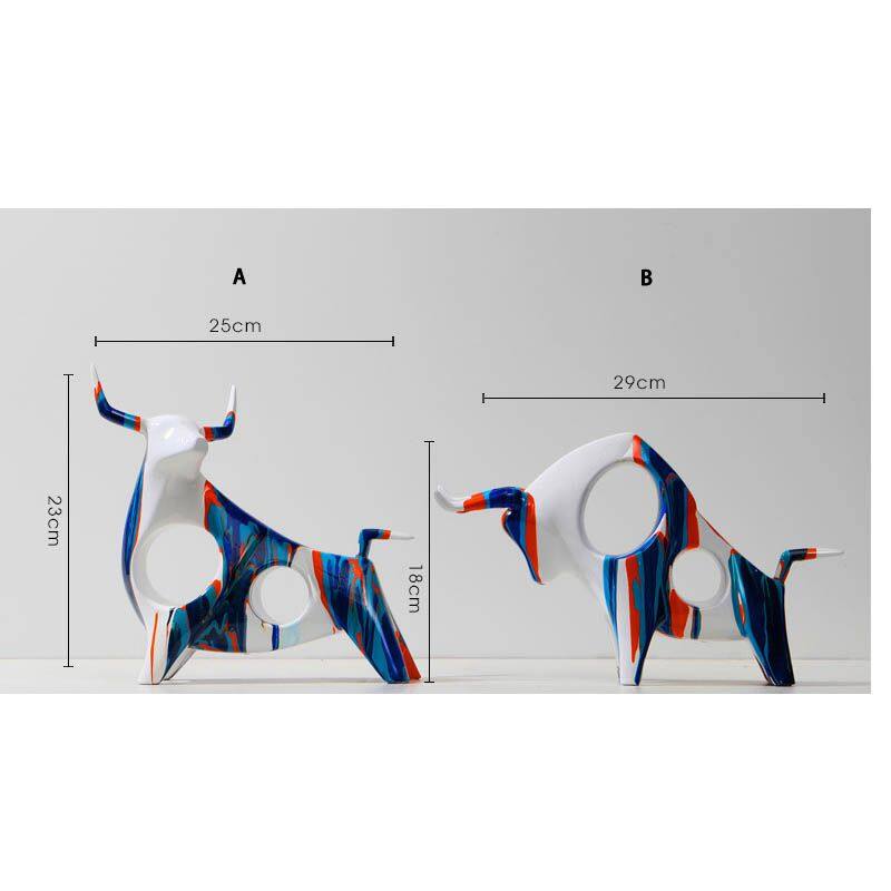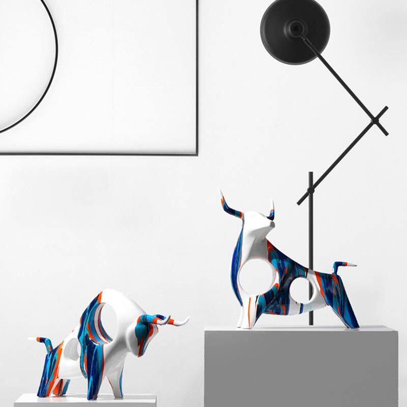 The Camouflage Ox set as home decor craft is made of resin through hand-painting technics,its design is belong to Nordic style, the Oxes are painted by some colorful line with hollow part, this posture reflects the simplest creative design. the ox raises head and the other ox lower head as a whole set,