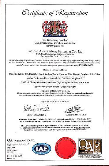 Kunshan Alex Railway Fastening Co., Ltd. is an ISO 9001/2008 certified company. All processes are in accordance with the requirements of the ISO quality management system. From raw material to the finished products, we operate in accordance with standard procedures. We have strict quality control systems for suppliers:
