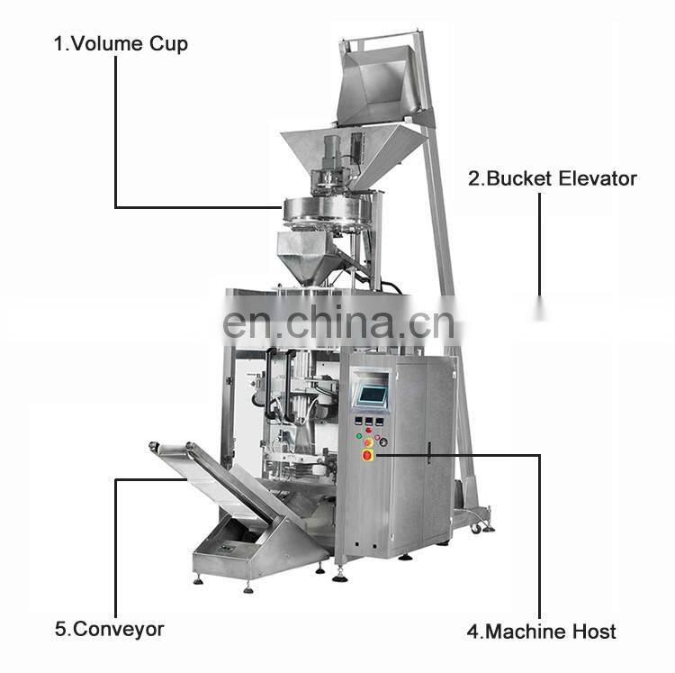 Applications:Volumetric cups packing machine is suitable for granule products.Such as granule puffed chips,grains,rice,dried fruits,beans,nuts,salt,sugar,tea,seeds,ect.
