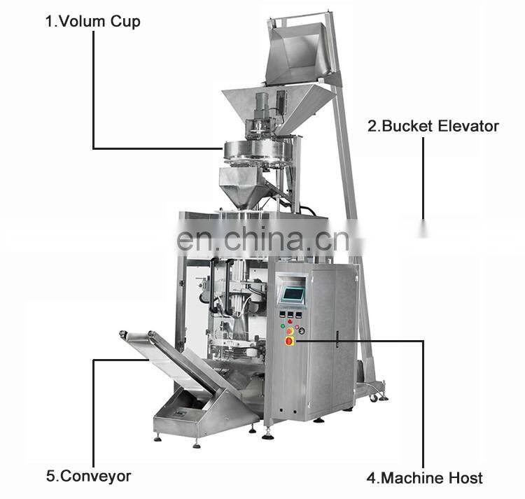 Applications:Volumetric cups packing machine is suitable for granule products.Such as granule puffed chips,grains,rice,dried fruits,beans,nuts,salt,sugar,tea,seeds,ect.