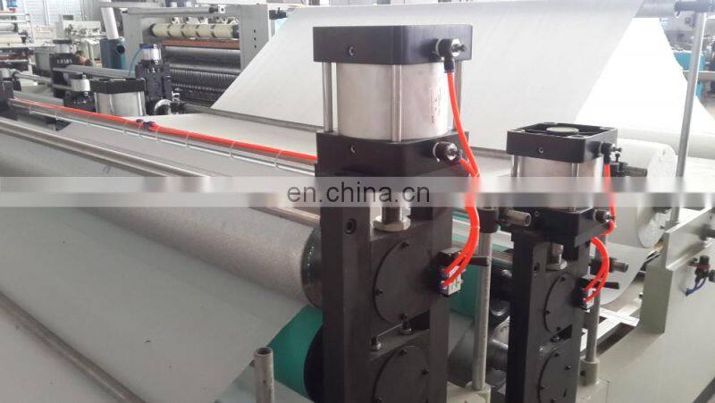 This equipment produces jumbo roll toilet paper and towel roll. It has the automatic function of embossment, perforation, slitting and rewinding ,all of them can be finished on one time. This machine equipped with pneumatic jumbo roll lifter , pneumatic belt driving, tension adjustment and so on. Adopt air-shaft for reeling.