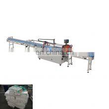 1.This equipment can connect with auto cutting machine to be a production line. Only need one person bagging . Conveyor belt automatic conveying, automatic stacking, paper feeding, bagging, sealing and cutting.