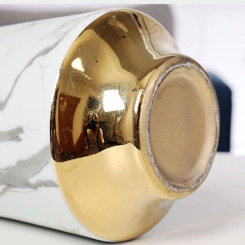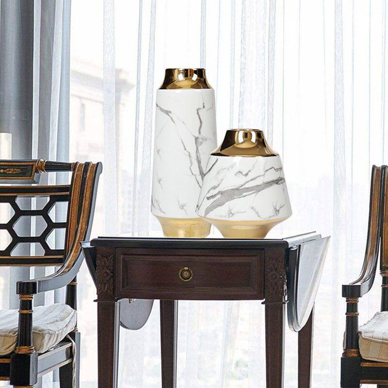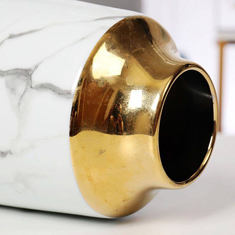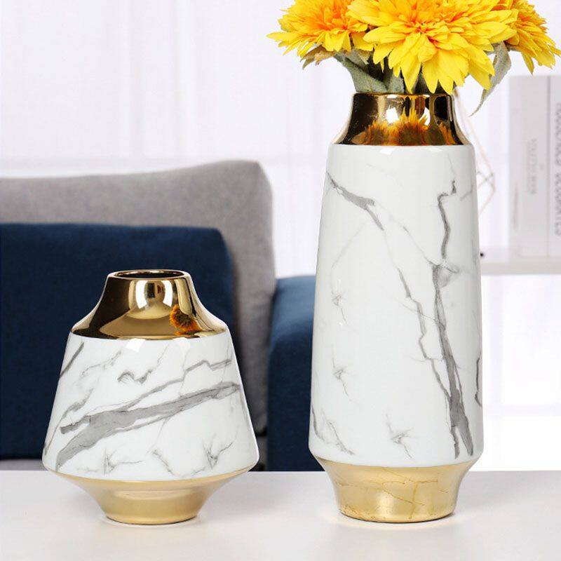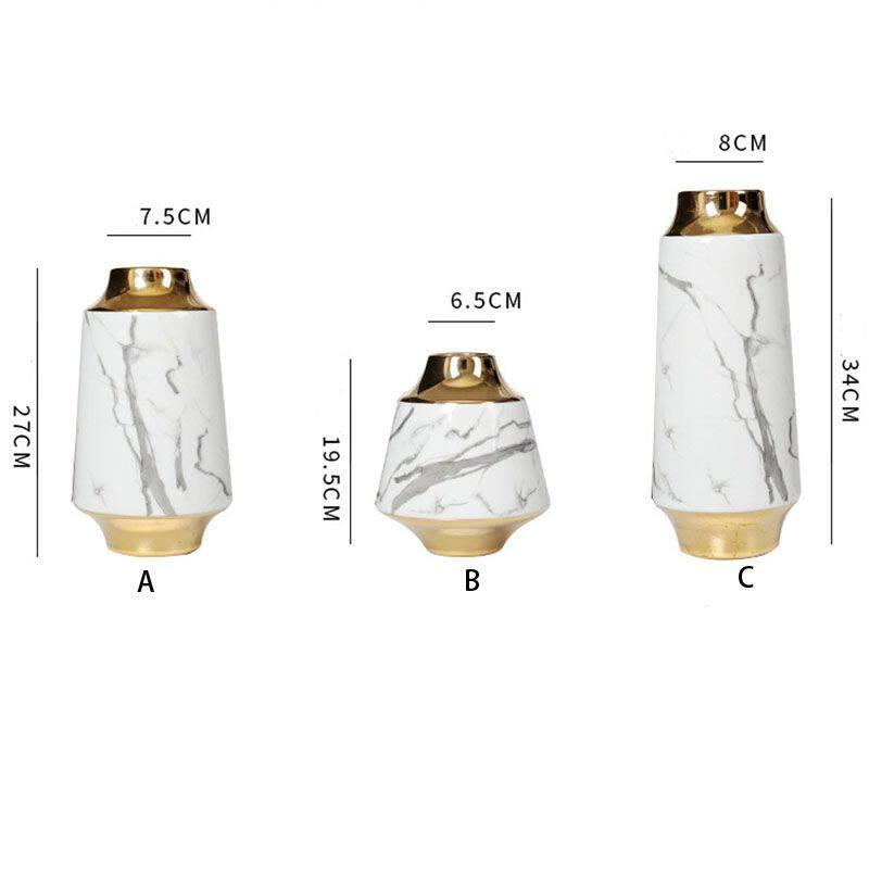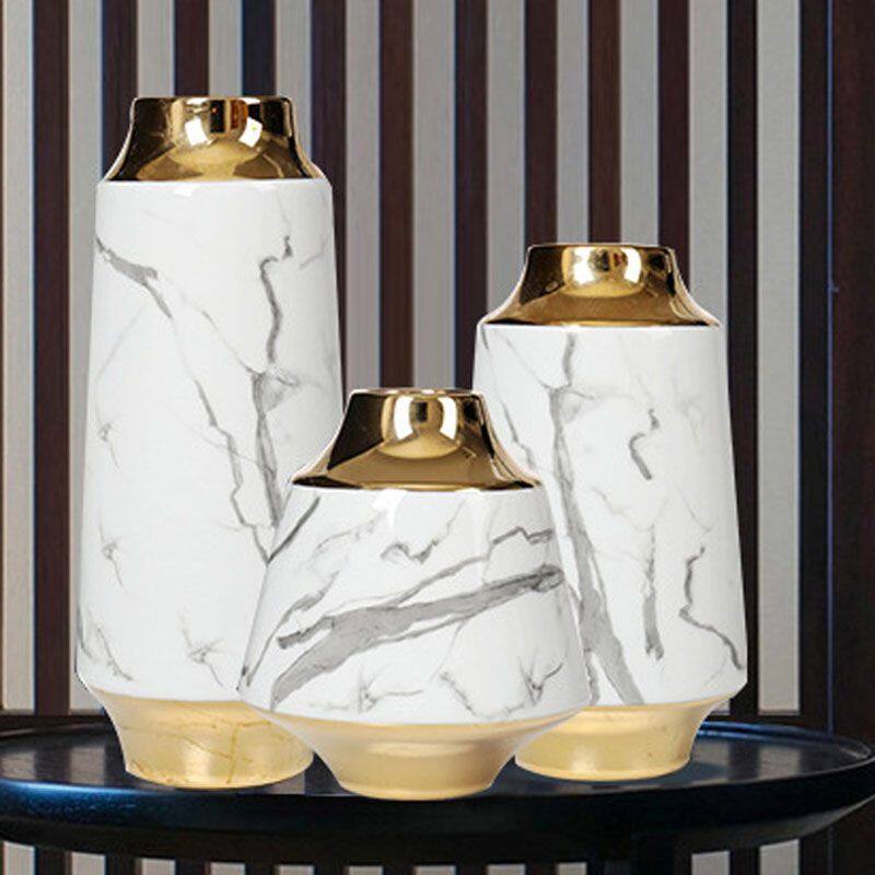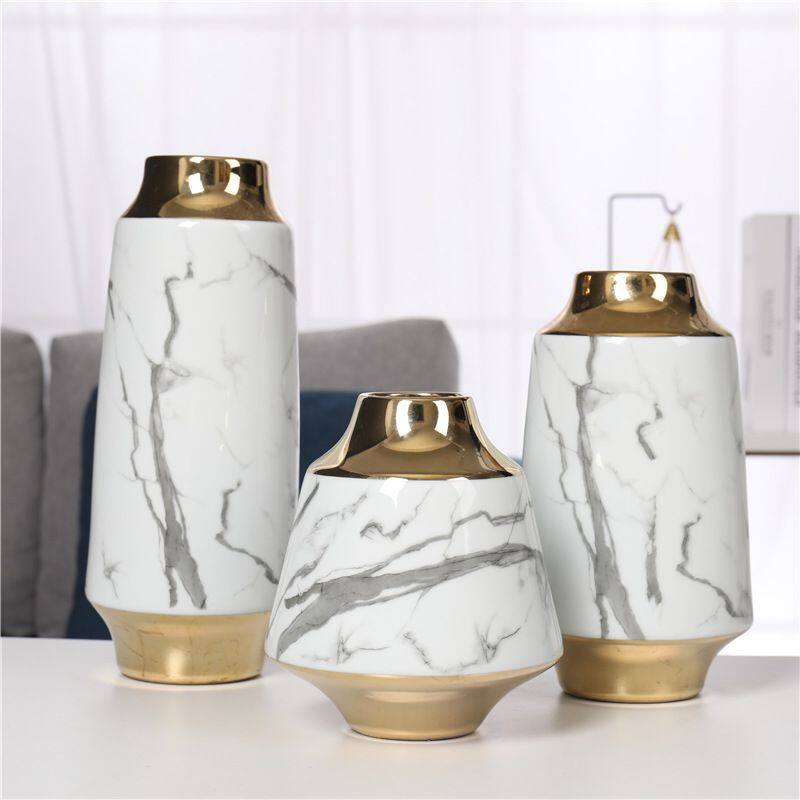 This ceramic vase is a set of three pieces, the material is high temperature ceramic, relatively heavy, using glaze, electroplating, applique process is pure handmade, each is unique, the surface process is glaze, applique and tracing gold.Characterized by never seepage, never deformation, never fade.The vase comes in three designs, with a white marble bottle and a gold top and bottom.You can customize and print the LOGO.