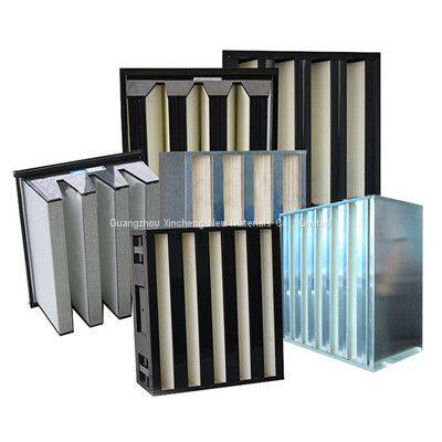 V-shape Hepa Air Filter is a kind of deep loading, high efficiency air filter fitting through both permanent air flow systems. It is constructed of multiple media packs in V-bank installed in a plastic coated galvanized sheet metal box . Its media area is largely extended compared with ordinary air filter.