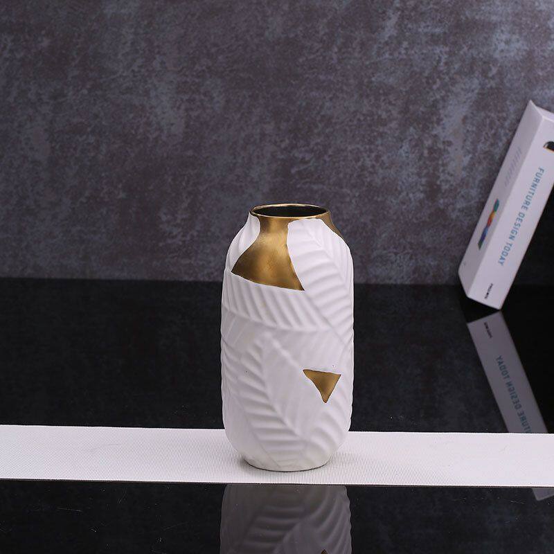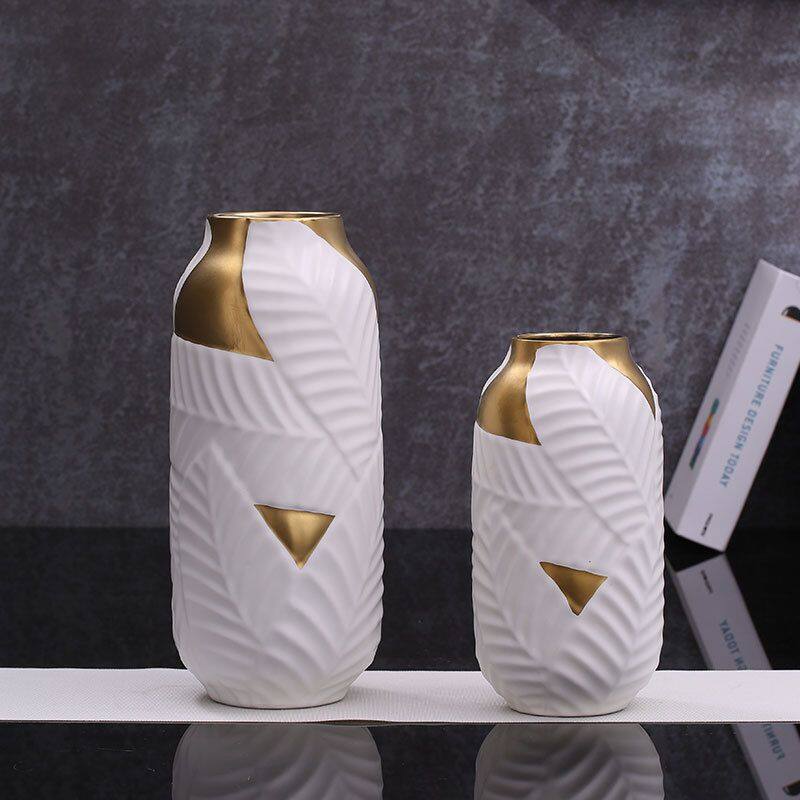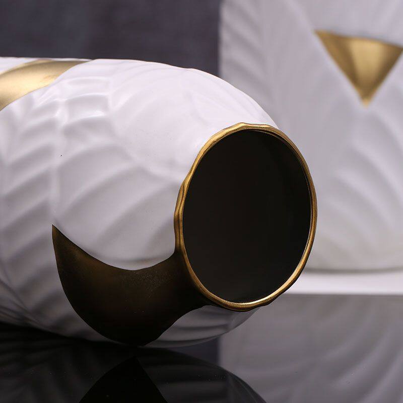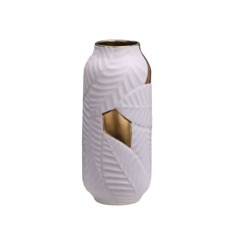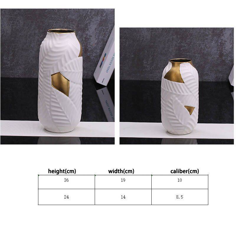 This ceramic vase is made of white porcelain, which is partly made by hand and partly made by machine, with decals on the surface and leaves on the bottle.The vase is white and gold plated and comes in two sizes.