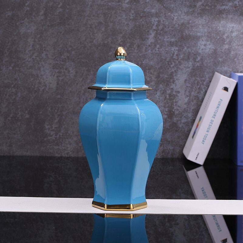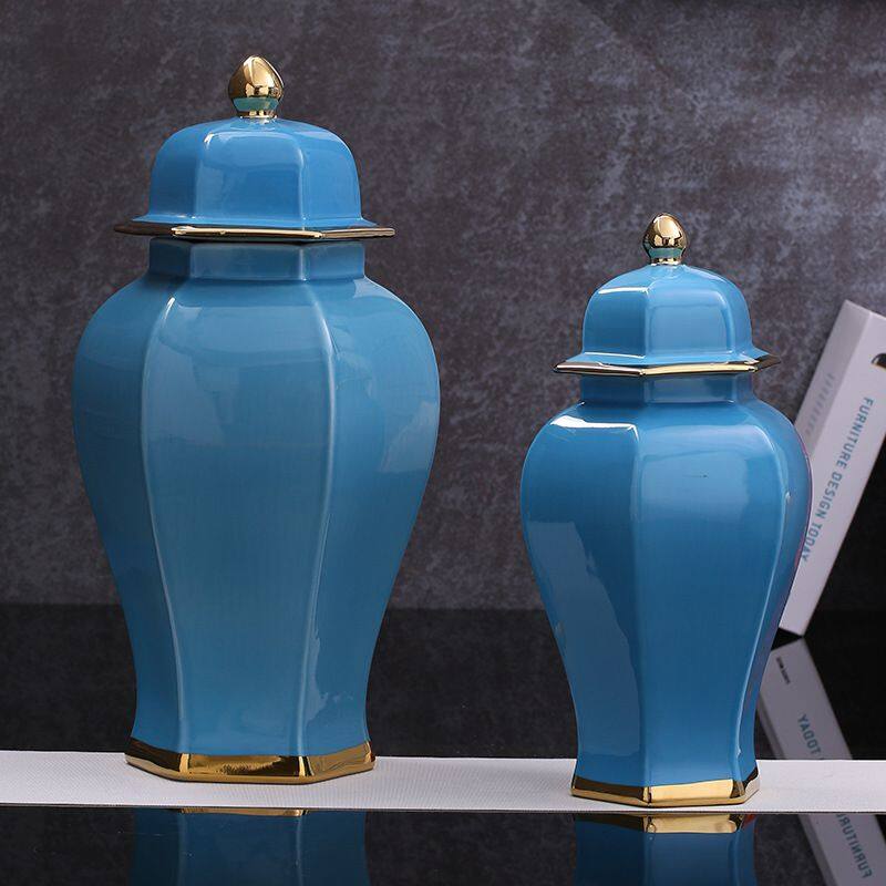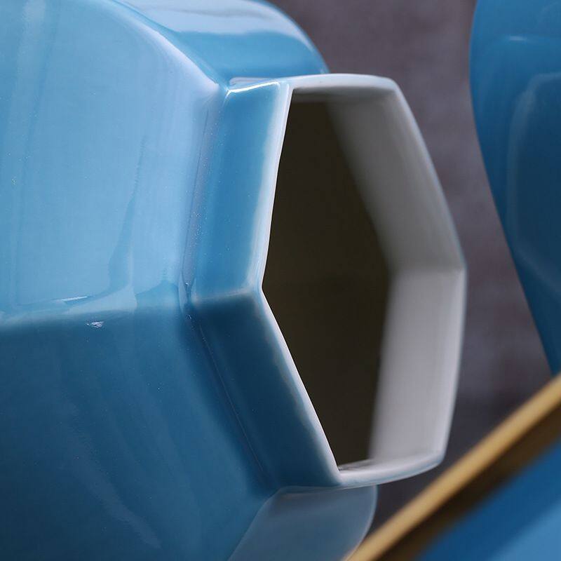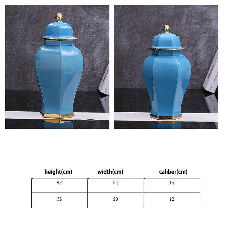 Hexagon New Chinese Style Large Blue Gild Ceramic Vase Decoration Art For Hallway TV Bench