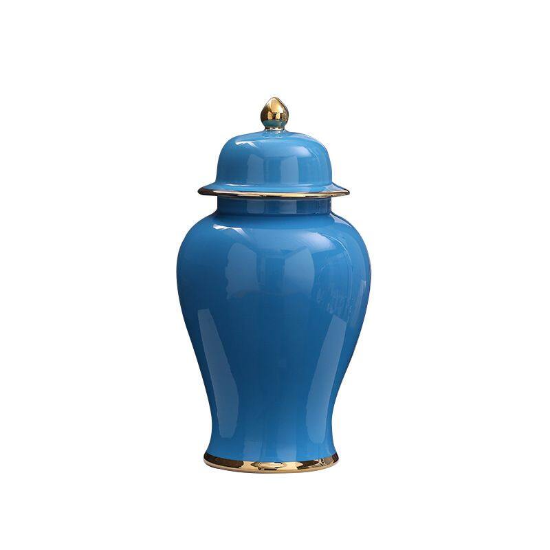 This ceramic decoration material is white porcelain, using the color glaze process, semi manual semi mechanical production, surface process is glaze.The vase is blue and gold plated and comes in two sizes.