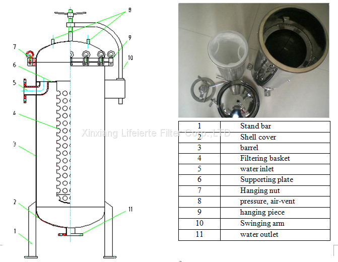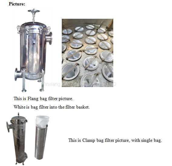 The filter is a kind of pressure type filtering device, and the liquid flow from the filter casing side entrance tube into the bag. The bag itself is fixed in the reinforcing net. Qualified filtrate can be acquired when the liquid penetrates the required fineness grade bag and the impurity particles will be captured. It is very convenient to replace the filter bag with only a little bit material consumption.