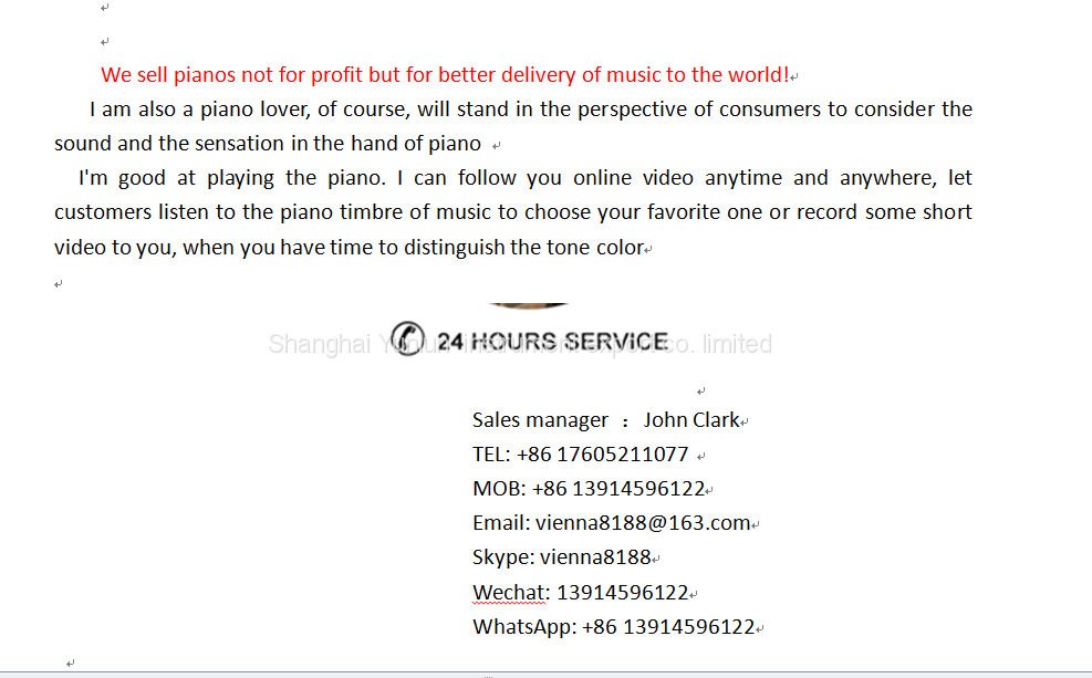 I'm good at playing the piano. I can follow you online video anytime and anywhere, let customers listen to the piano timbre of music to choose your favorite one or record some short video to you, let you go, when you have time to distinguish the tone color
