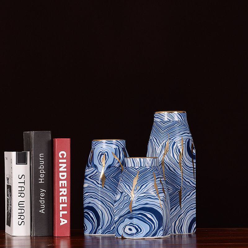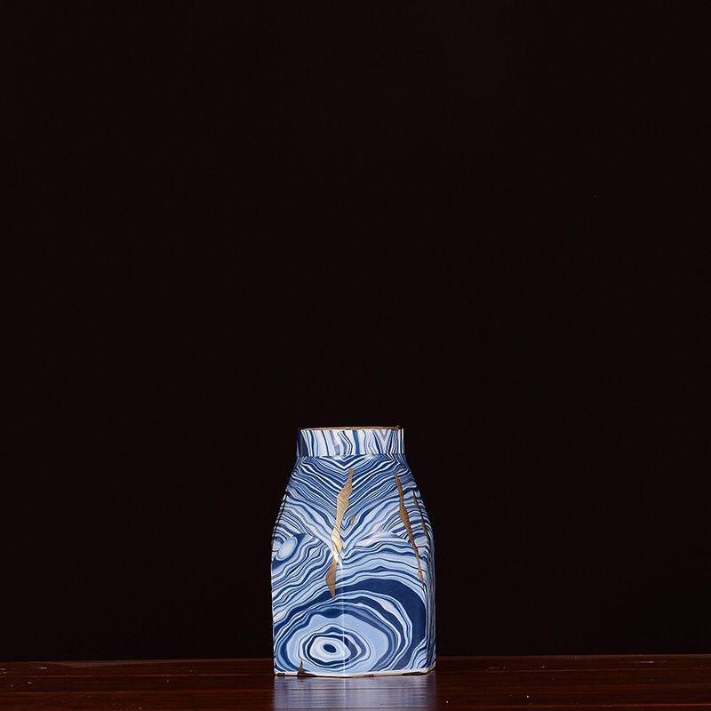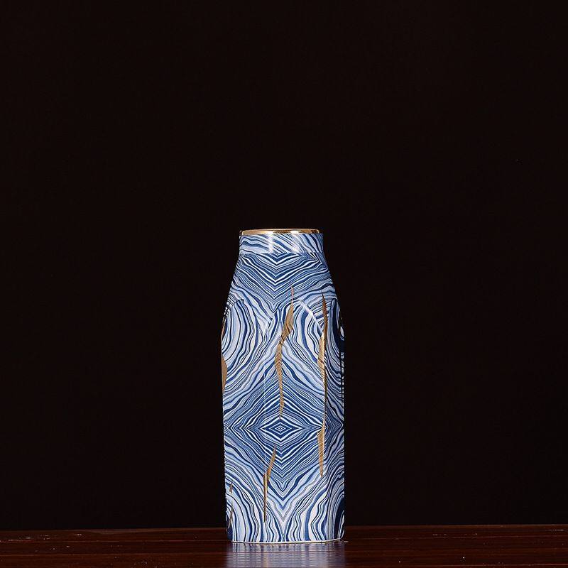 This ceramic vase is six square, made of high-temperature white porcelain, relatively heavy, all hand-pulled and hand-carved, each set is unique.Using electroplating process, the production method is semi-manual and semi-mechanical, the origin is Jingdezhen, Jiangxi, China.The vase is blue and white and gold plated and comes in three sizes.