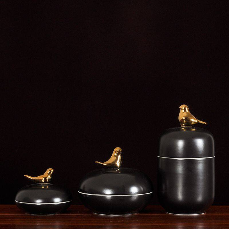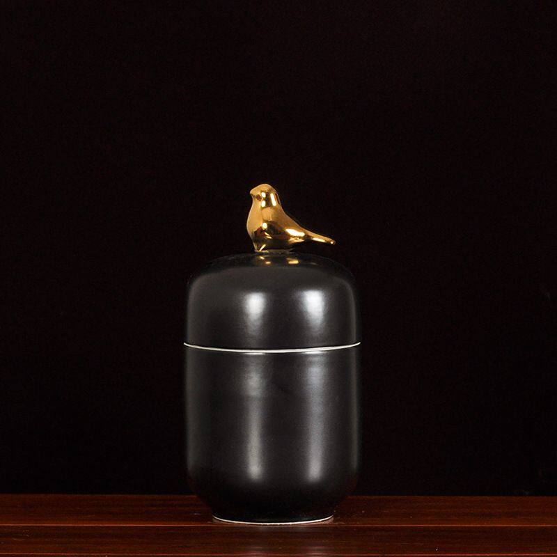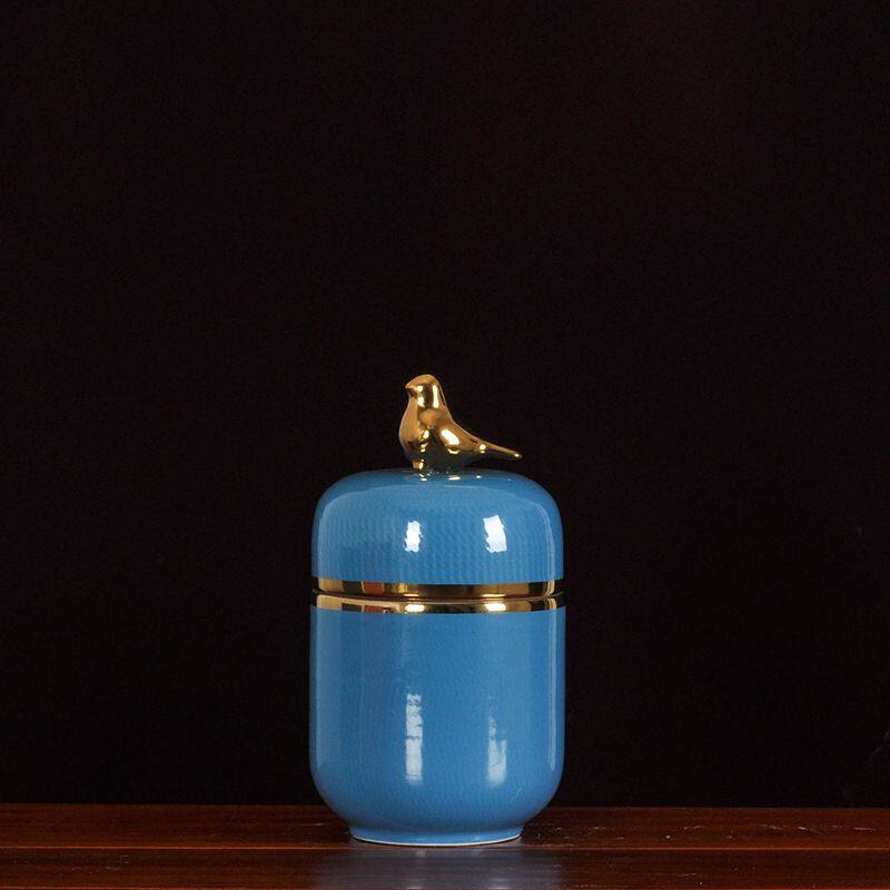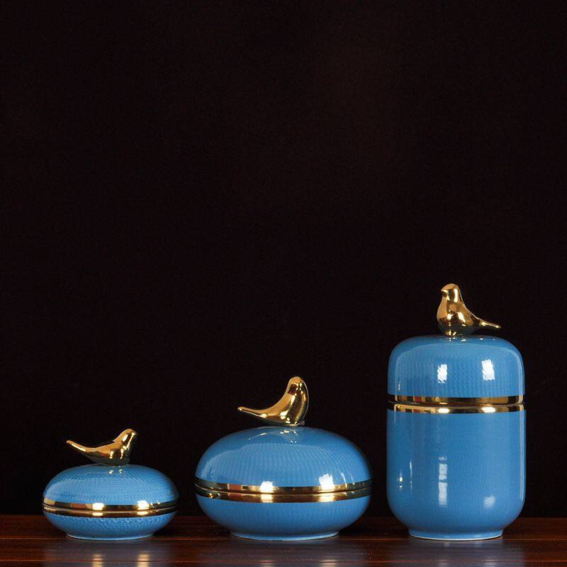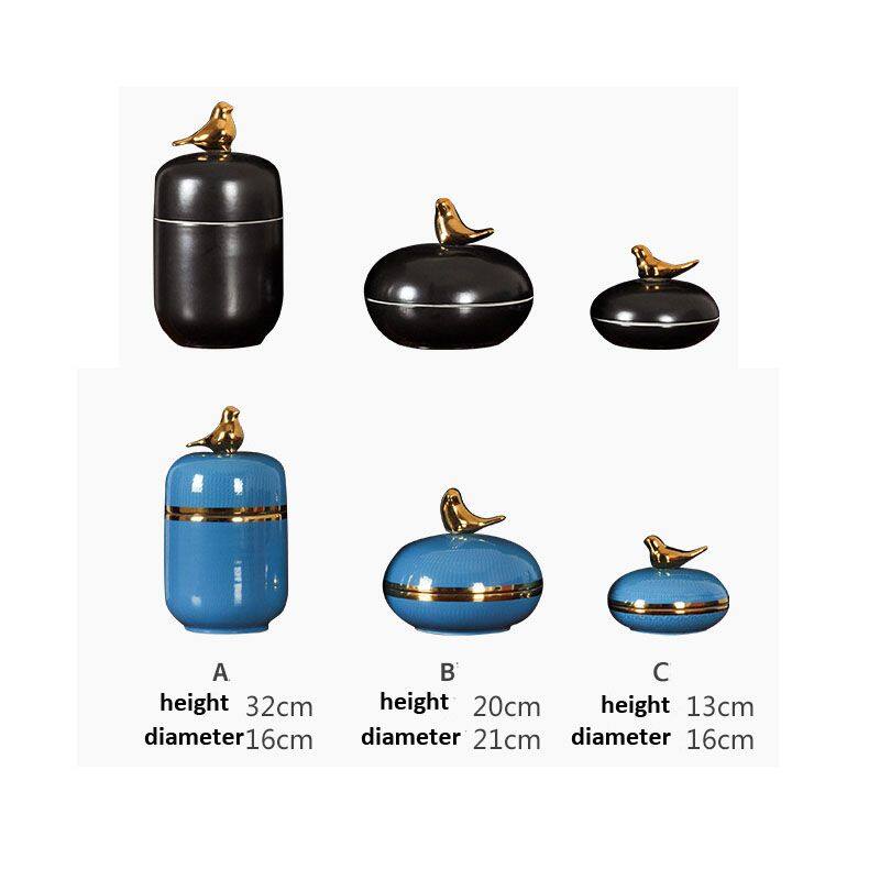 This ceramic vase comes with a metal lid in the shape of a bird. It is made of high-temperature white porcelain, which is quite heavy. It is all hand-pulled and hand-carved, each set is unique.Using electroplating process, the production method is semi-manual and semi-mechanical, the origin is Jingdezhen, Jiangxi, China.The vase comes in two colors, blue and black, and each color comes in three sizes.