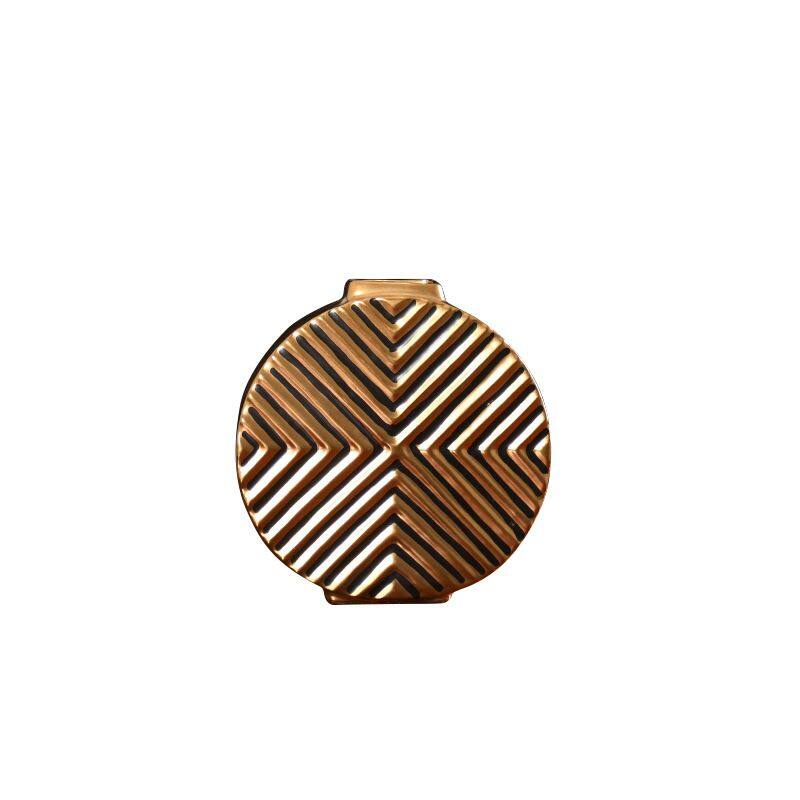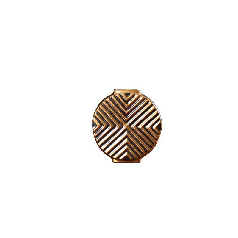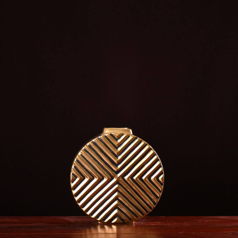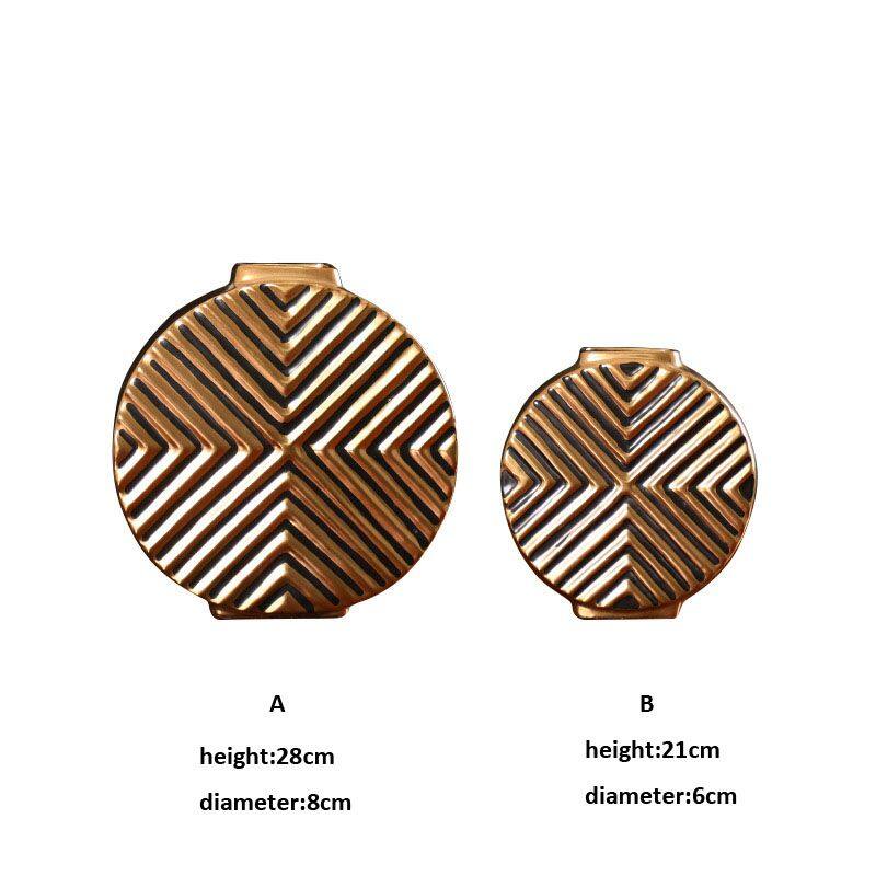 This ceramic vase is flat, the material is high-temperature white porcelain, relatively heavy, all hand pulled and hand carved, each set is unique.The color glaze process is used, the surface process is glazed, the production method is semi-manual and semi-mechanical, the origin is Jingdezhen, Jiangxi, China.The vase is gold in color and comes in two sizes.