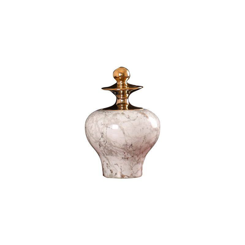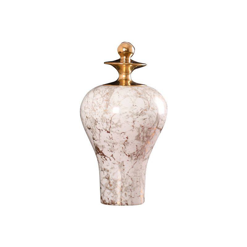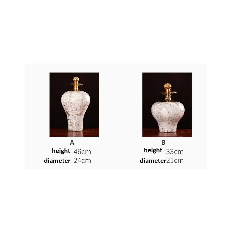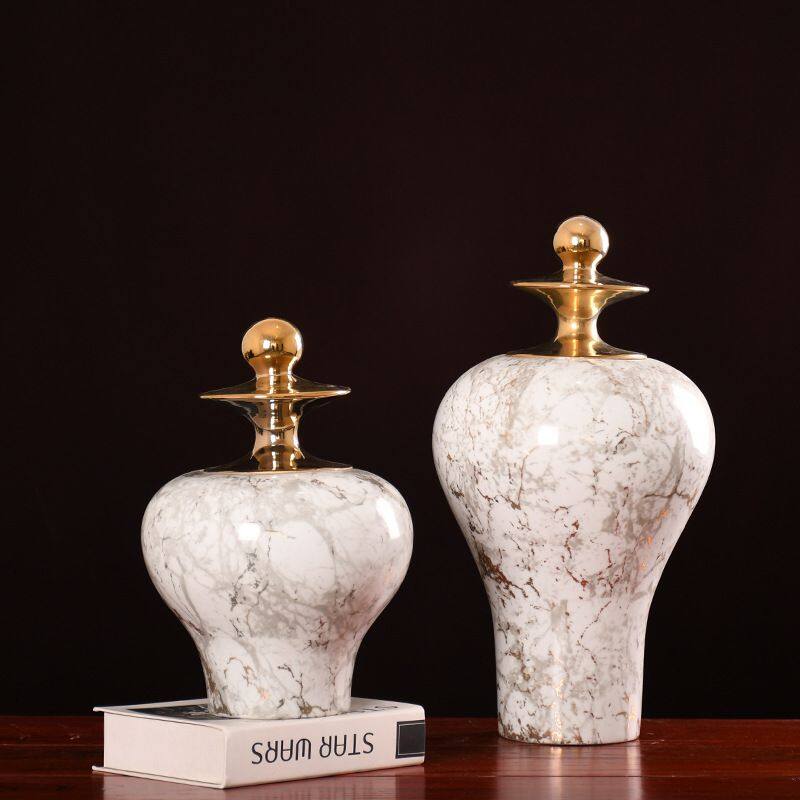 This ceramic vase is made of high-temperature white porcelain with metal LIDS. It is relatively heavy. It is all hand-pulled and hand-carved, each set is unique.The color glaze process is used, the surface process is glazed, the production method is semi-manual and semi-mechanical, the origin is Jingdezhen, Jiangxi, China.The vase comes in white and gold with a marbled surface pattern and comes in two sizes.