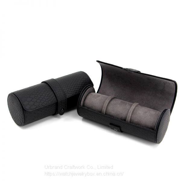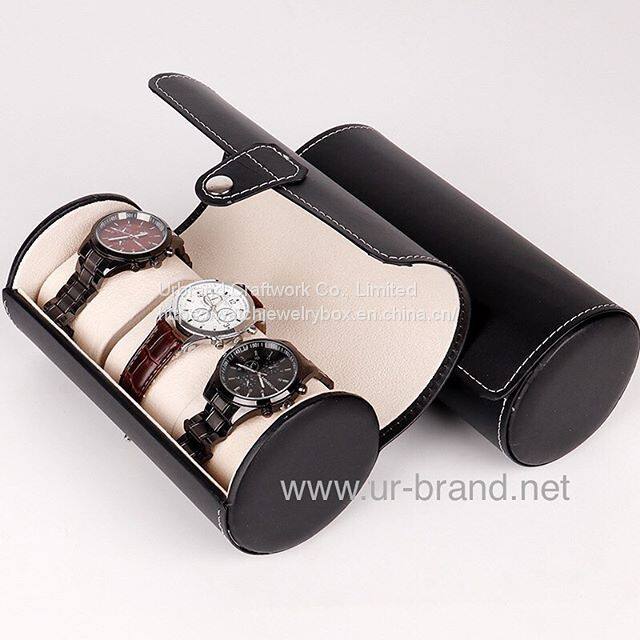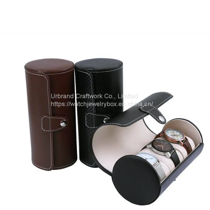 Round Shape Travel Portable 3 Cylinder PU Storage Case Leather Jewelry Display Watch Box