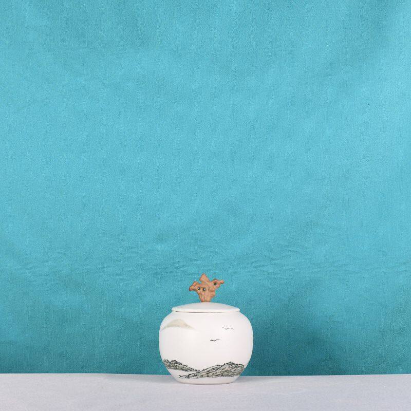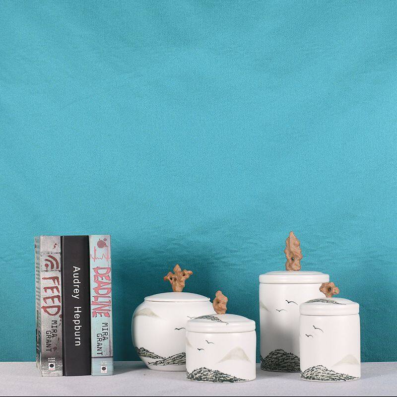 This ceramic vase has a lid, the material is high-temperature ceramic, relatively heavy, all hand-pulled and hand-carved, each set is unique.The color glaze process is used, the surface process is glazed, the production method is semi-manual and semi-mechanical, the origin is Jingdezhen, Jiangxi, China.The vase is white in color and the design is a landscape picture. It comes in four sizes.