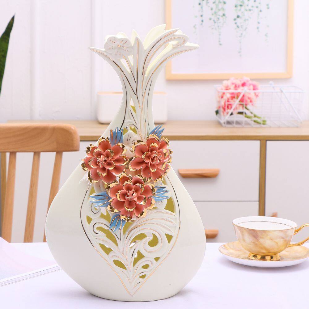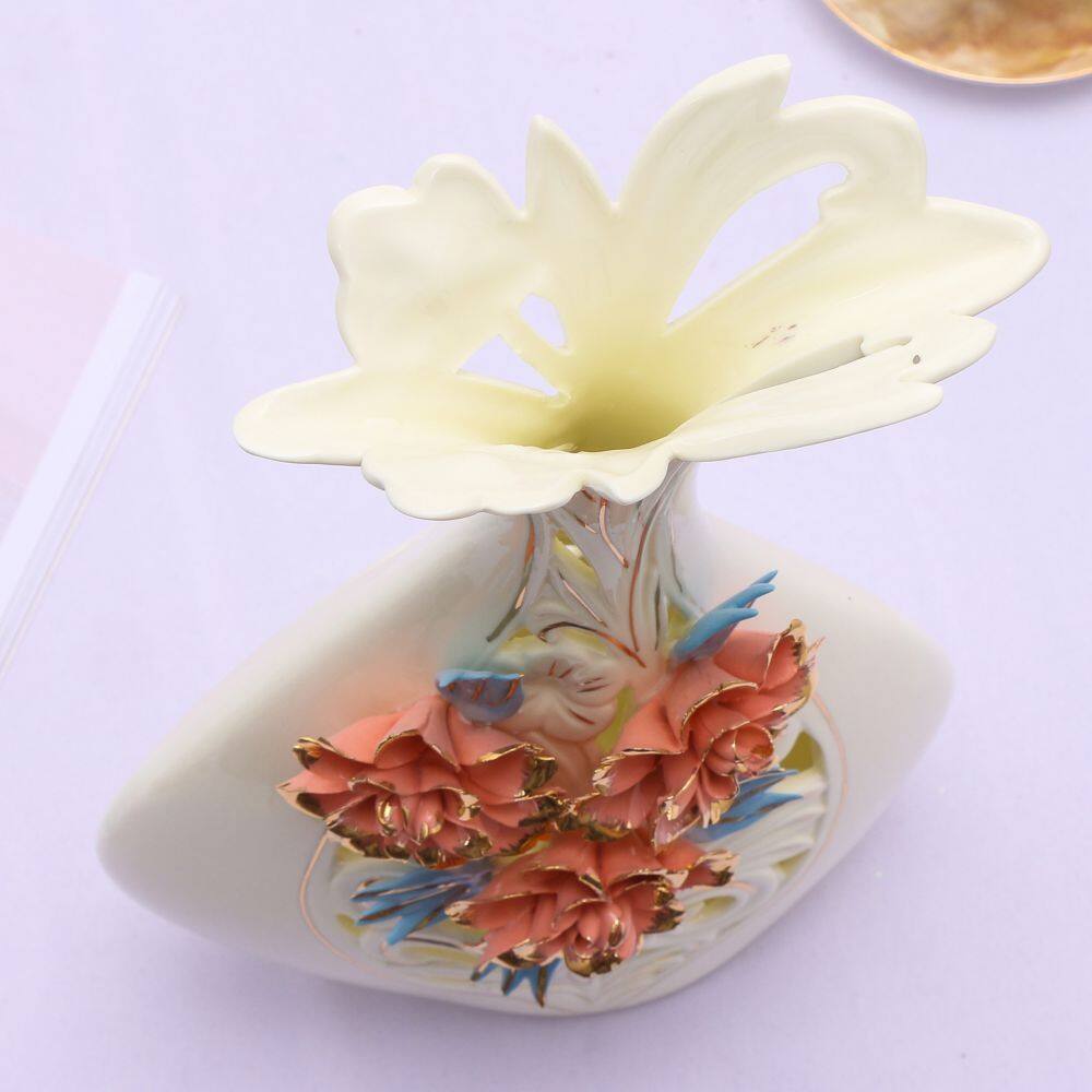 The material of this ceramic vase is high temperature ceramic, relatively heavy, all hand-pulled and hand-carved, each set is unique.Gold plating and hollowing were used.It is made by hand in Shenzhen, Guangdong, China.The vase has a white hollow body with red ceramic flowers.