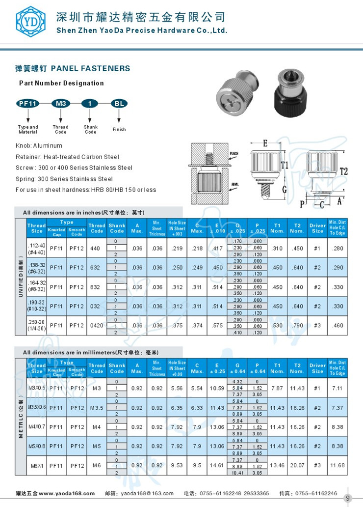 Panel Fastener YD-PF08, YD-PF-09 and YD-PF-10-M2.5 to 3 Thread Size, Made of Aluminum and Stainless Steel