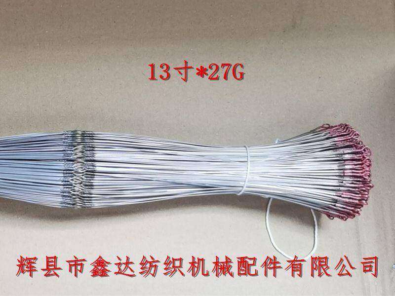 Huixian Xinda Textile machinery accessories provide 27G jacquard heald export loom nylon heald, 13 in 13"x27G refers to the length of nylon heald is 330mm, 27G refers to the thickness of single steel wire, 27G=0.4mm, round hole heald ear is mainly used to fix jacquard rope (through wire), textile export-oriented equipment product-27G jacquard heald is mainly used for old jacquard loom equipment.