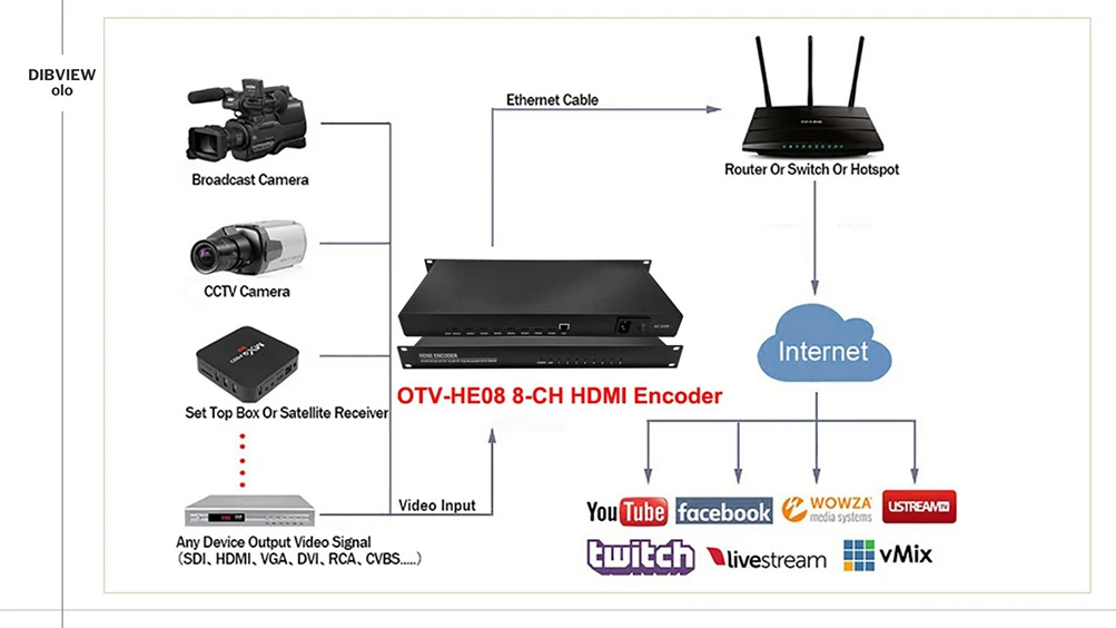 Home > Products > HDMI Encoder > DIBVIEWOLO OTV-HE08 1U Rack HEVC H.265 H.264 HDMI Video Stream Encoder For Live HD IPTV 8 Channels SRT RTMPs Facebook Youtube