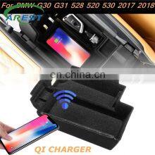 Fast Charging Car Phone Wireless Charger Central Armrest Storage Box Coin Box Key Pen Organizers For G30 G31 5-Series 2017 2018