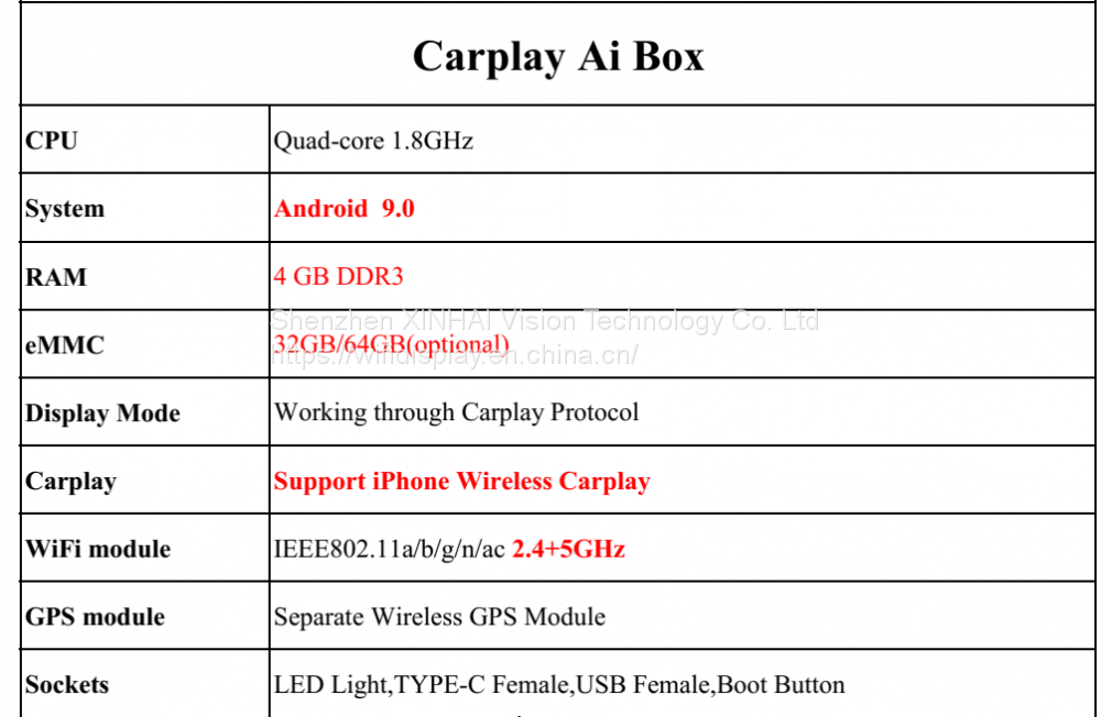 | Network | wifi | Connect the Stream Media Carplay box to the wireless device wifi to get the net work |