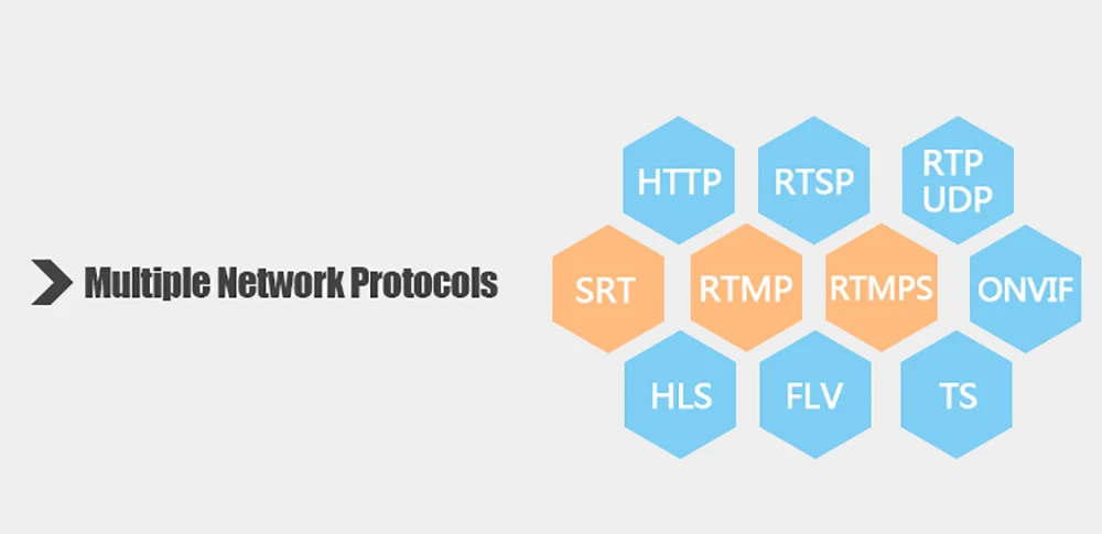 Program Streaming HTTP, RTSP, RTMP, RTMPS, SRT, HLS, FLV, ONVIF(UDP/RTP)