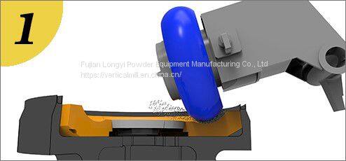 Because of centrifugal force, the materials would move towards the fringe of disc and then enter the grinding zone between grinding roller and disc to be ground. The materials which have been ground would keep moving toward fringe of grinding disc until they spill out of the disc. Through air inducing ring on the fringe of grinding disc, airflow sends these spilling materials to powder classifiers for classifying. The coarse powders which don’t meet the requirement of fineness would fall to the disc for another grinding while these qualified powders, as finished products, would be collected into dust collector and finally sent to finished product silo by conveying system for storage and packaging.