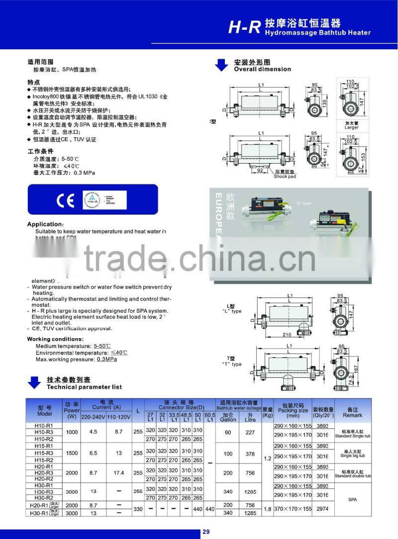Casing is usedφ57(2″)stainless steel pipe, low-power density heater element design. The products are safe and reliable. Many types of anti-dry protection for choosing. It is available for SPA large pool circular heating.